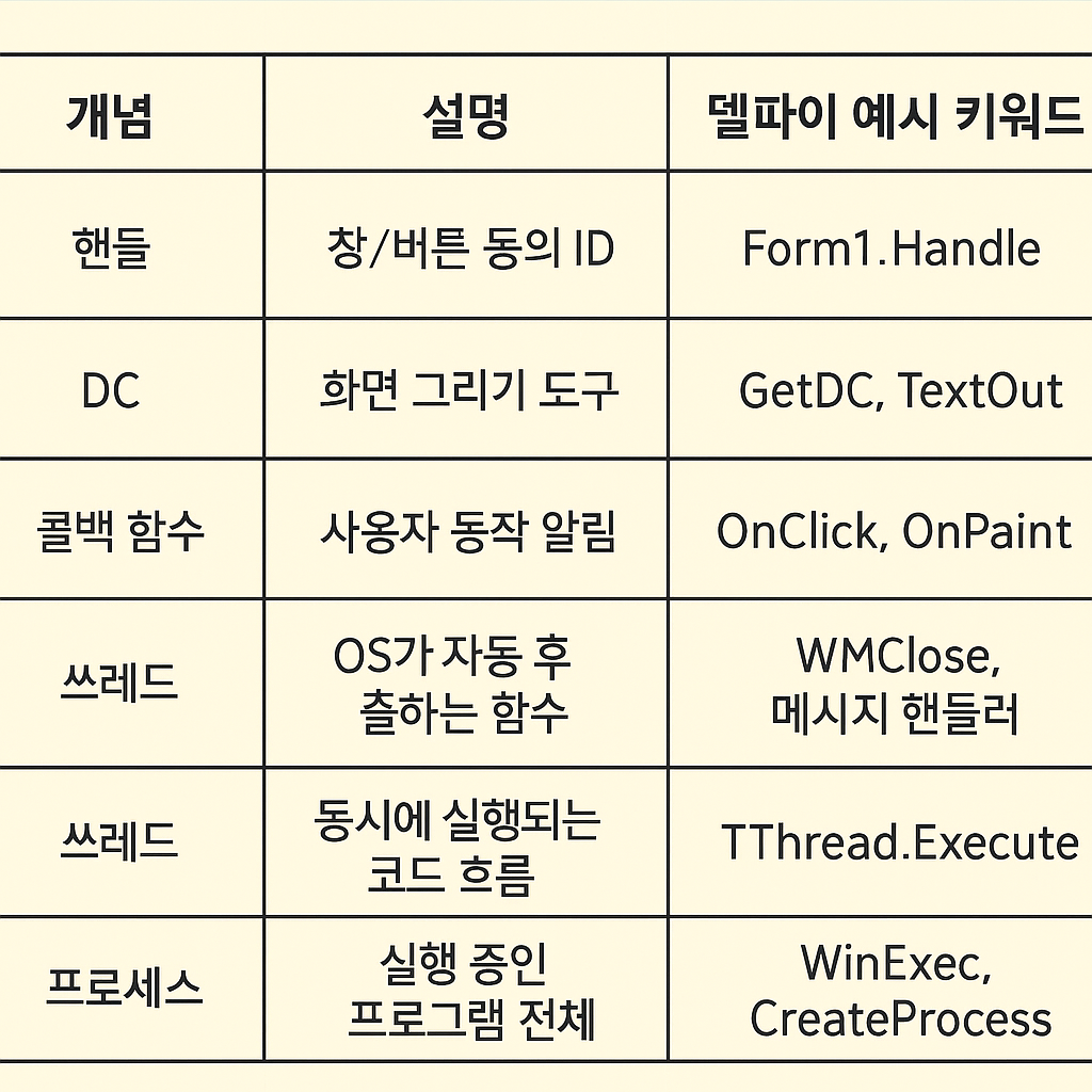델파이7, 윈도우프로그래밍, 윈도우핸들, 디바이스컨텍스트, 델파이초보, 콜백함수, 이벤트처리, 쓰레드이해, 프로세스개념, 델파이예제, PC개발기초, 윈도우개발입문