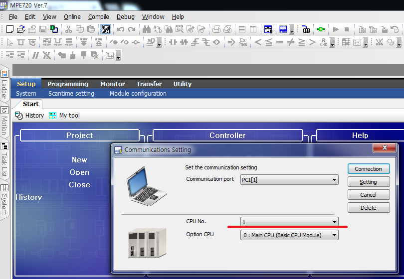 MPE720을 실행하고, 아래처럼 CPU를 선택한다.