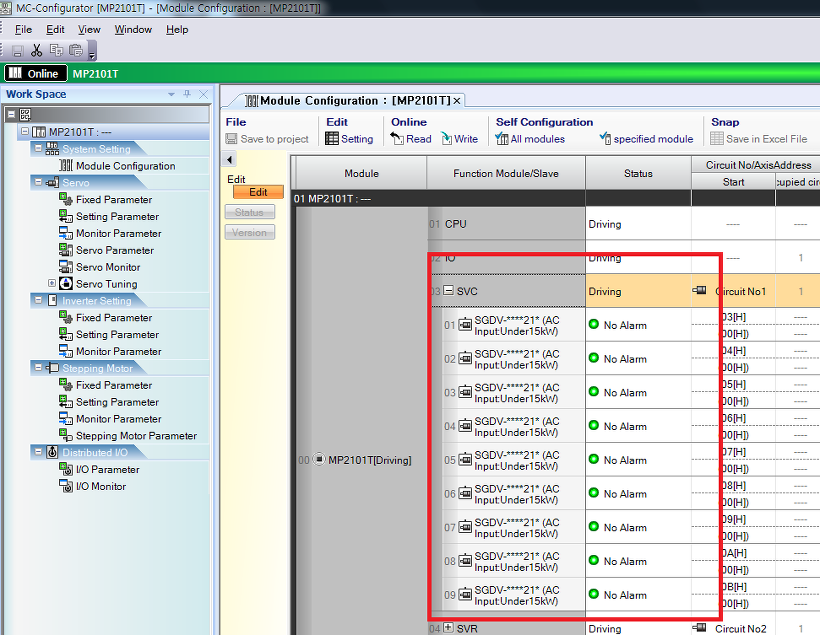 아래처럼 No Alarm 상태로 연결된 서보팩을 확인할 수 있다.
