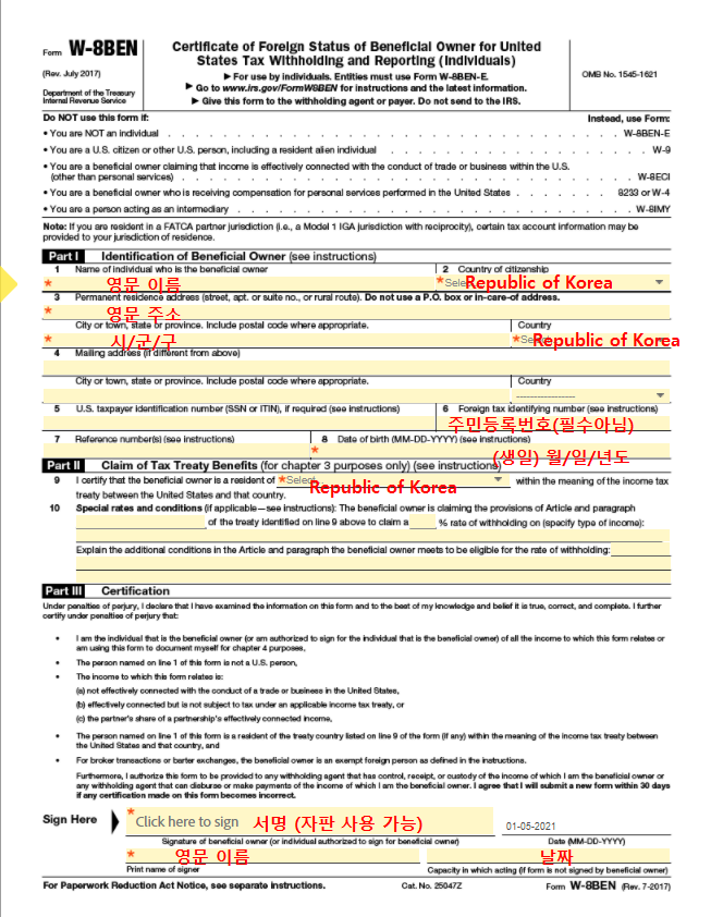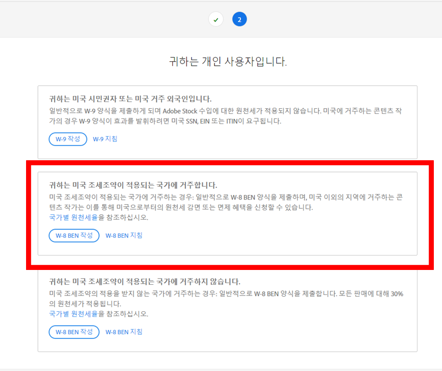 ※ 한국은 미국 조세조약이 적용이 되어 두번째 항목을 선택 합니다.
