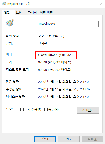 ※ 정상적인 경우 (C:\Windows\System32\mspaint.exe)