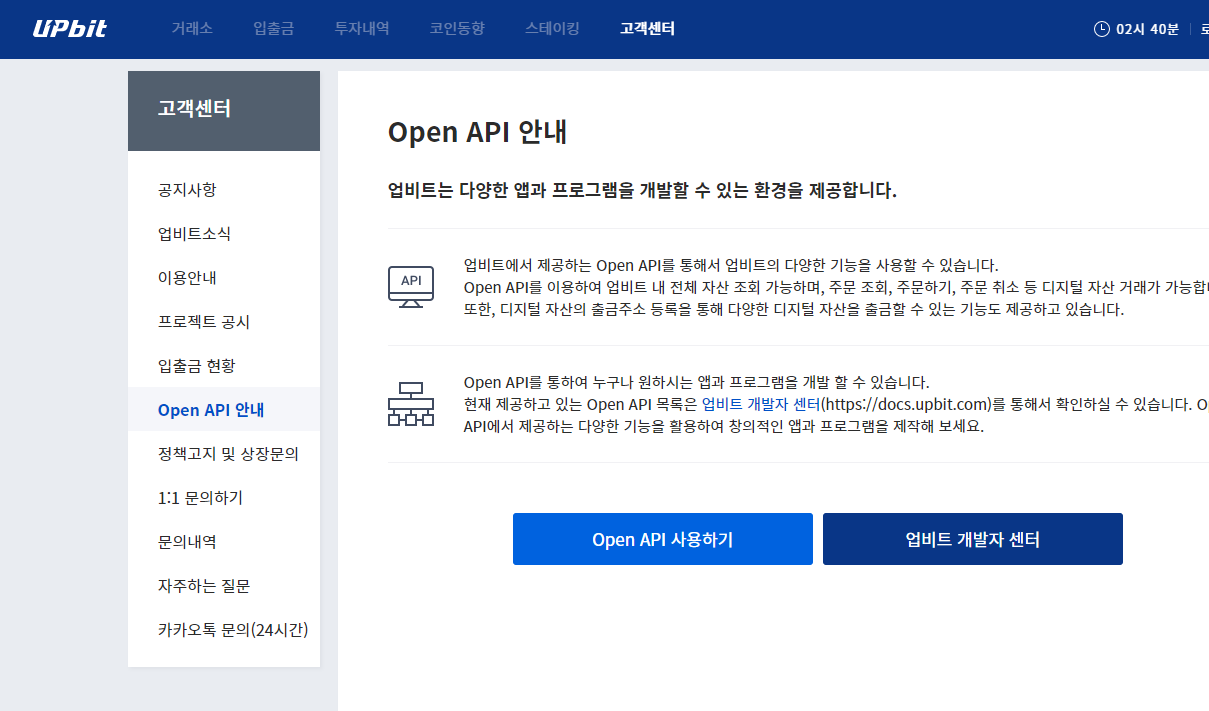 ※ 업비트 접속 → 고객센터 → Open API 안내 → Open ApI 사용하기 Click!