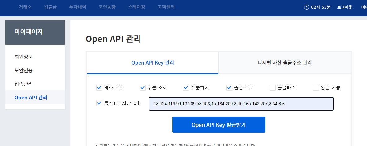 ※ 헤이비트를 이용 시 헤이비트에서 제공하는 ip를 입력 후 API를 제공 받아야한다.