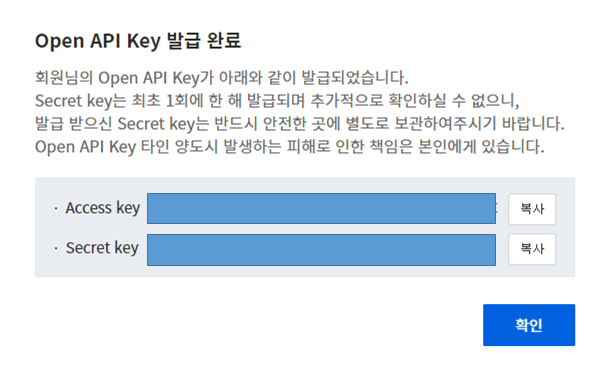 ※ 이와같이 "Access / Secret" Key 발급이 되면 원하시는 곳에 붙여 넣기 하여 사용 하시면됩니다.