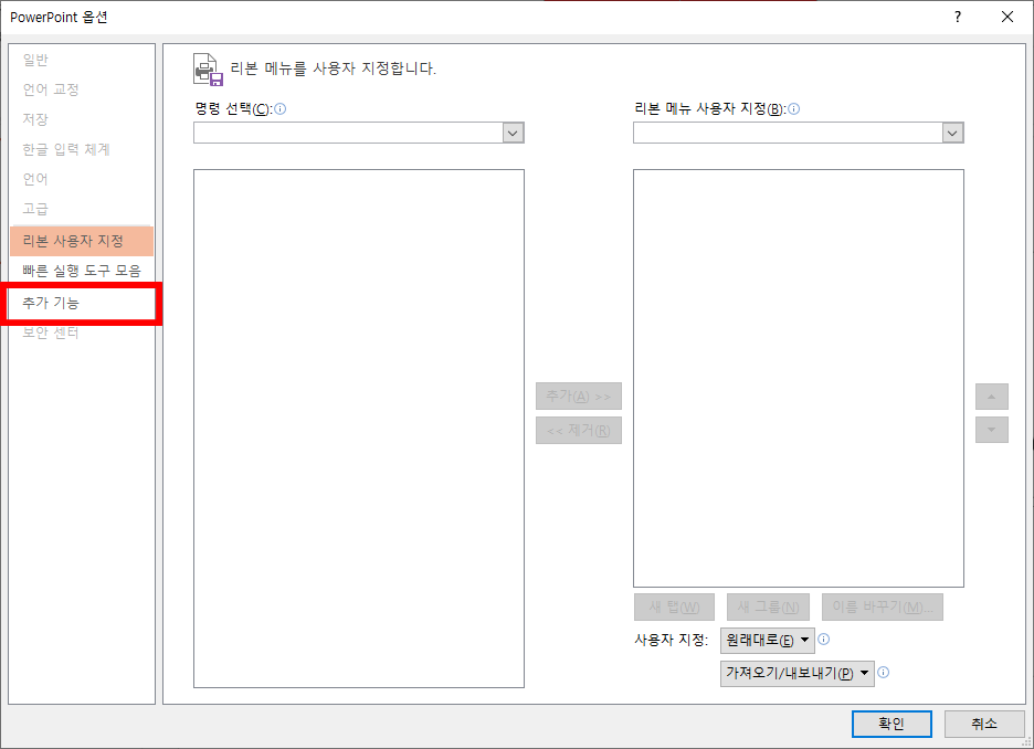 ※ 아래와 같은 사진처럼 "PowerPoint 옵션" 에서 "추가 기능" 선택
