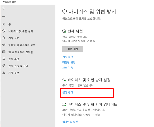 ※ 바이러스 및 위협 방지 → 바이러스 및 위협 방지 설정 "설정 관리" Click