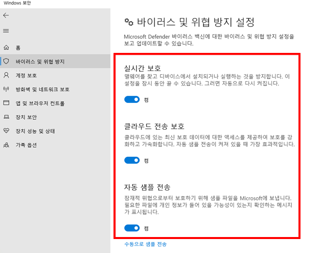 ※ 설정 관리에서 "실시간 보호", "클라우드 전송 보호", "자동 샘플 전송" 을 전부 Off 한다.