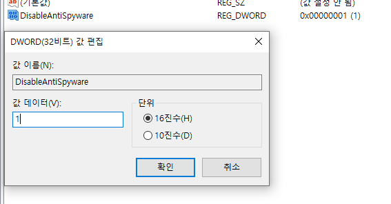 ※ 위에 그림과 같이 "DisableAntiSpyware" 존재 하면 해당 데이터를 "0" 에서 "1" 로 변경