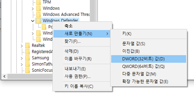 ※ "Windows Defender" 에서 마우스 오른쪽 클릭 → 새로 만들기 → DWORD(32비트) Click!