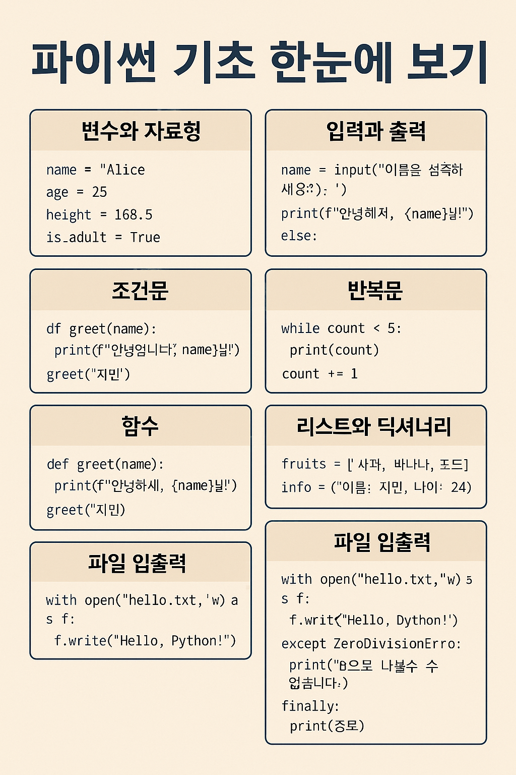 파이썬기초,파이썬요약,코딩복습,조건문,반복문,함수,리스트,딕셔너리,입출력,예외처리